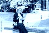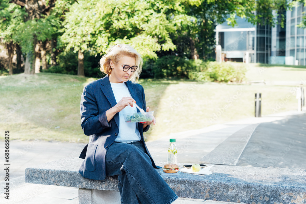 Middle-aged business woman having lunch sitting on bench at office park in sunny day. Balanced diet lunch box for weight loss. Healthy eating habits and well-being. Selective focus