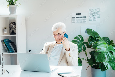 Middle aged gray hair businessman talking on mobile phone and using laptop while working at home office. Confident, experienced senior male professional. Small business entrepreneur manage business