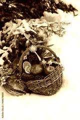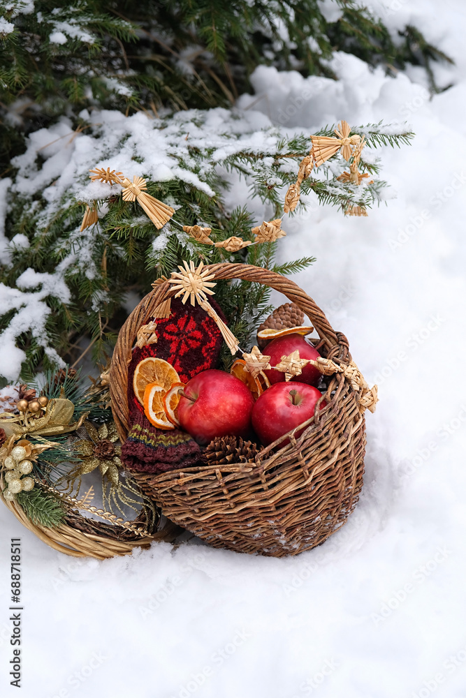 wicker basket with fresh apples, decorations, knitted mittens, cones in snowy forest. Winter nature background. Christmas, New Year holidays. cozy hygge atmosphere. festive winter season.