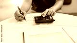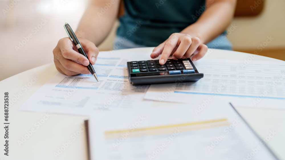 Close up of hand using calculator calculating personal finance for income and expenses..