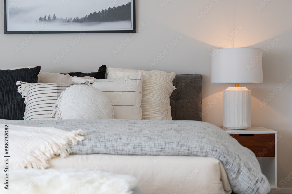 Relaxing bedroom detail of grey, black and white striped pillows and layers of bedding on large bed with simple white side lamp.
