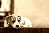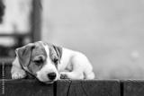 Tiny Jack Russel terrier puppy with sad eyes on the wooden terrace near his house. Dogs and pets photography