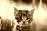 Small grey kitten with blue eyes in grass close up. Cat portrait