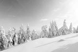 Scenic winter shot of evergreen trees on a snowy mountain clearing. Winter mountains landscape
