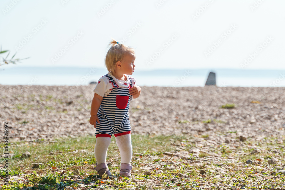 Cute child girl baby toddler In striped jumpsuit walks on pebble beach outdoors in summer