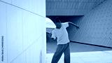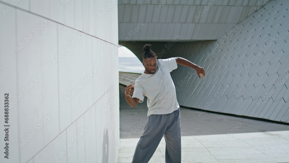 Inspired dancer practicing choreography at street. Active man dancing freestyle