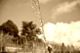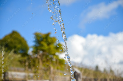 Flow of fresh and clean drinking water. Dewdrop, splash and bubbles on motion with natural background
