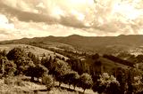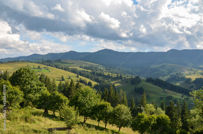 Sunlight and clouds over the summer mountains covered green forest and grassy slopes of mountain range. Carpathian Mountains, popular travel destination of Ukraine