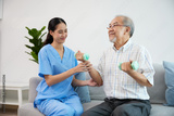 nurse or caregiver helping elderly patient to physiotherapist and exercise for rehabilitation at home