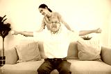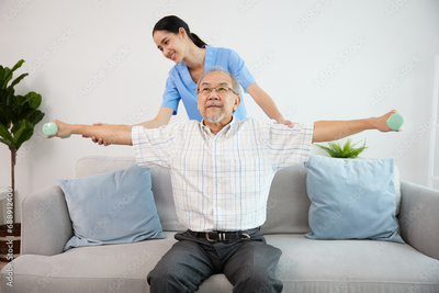 nurse or caregiver helping elderly patient to physiotherapist and exercise for rehabilitation at home