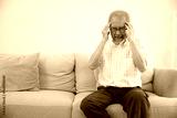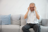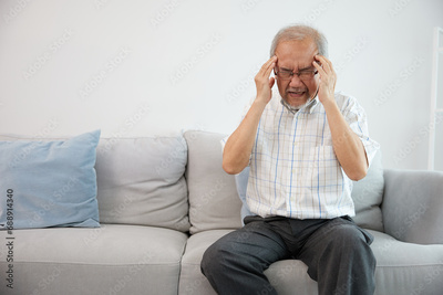 senior asian man suffering from headache on sofa