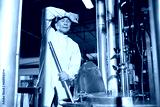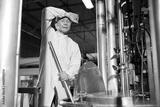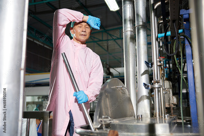 senior worker feeling tired from work beside large industrial pot in the factory