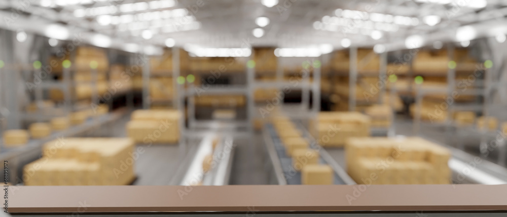 Mockup space on a wooden tabletop with a blurred background of a a modern distribution warehouse.