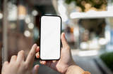 A smartphone mockup in a woman's hand with a blurred background of retail shops on the street.