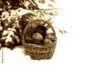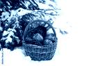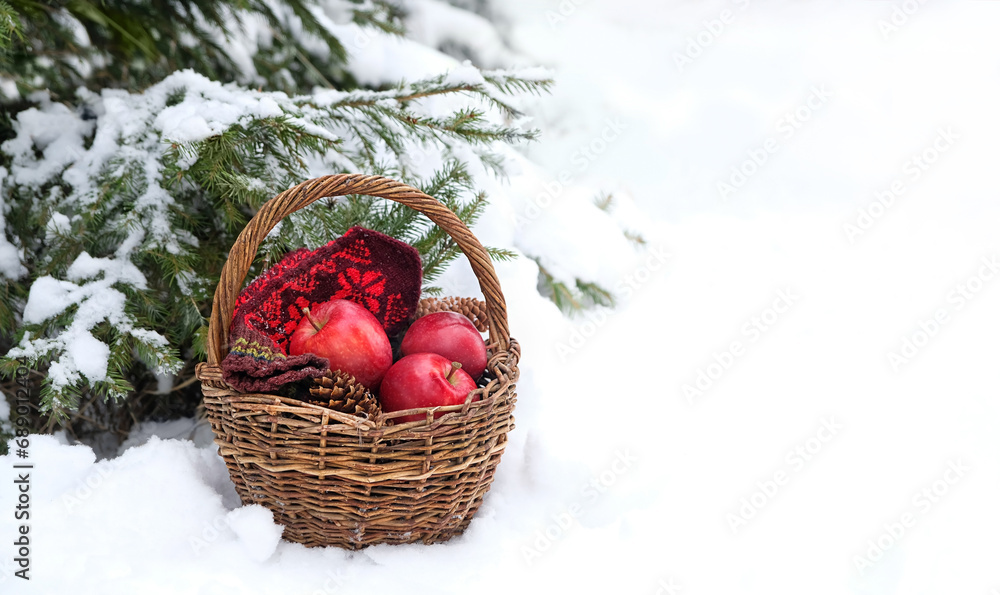 wicker basket with apples, knitted mittens, cones in snowy forest. Winter nature background. Christmas, Yuletide, New Year holidays. festive winter season. template for design. copy space