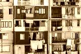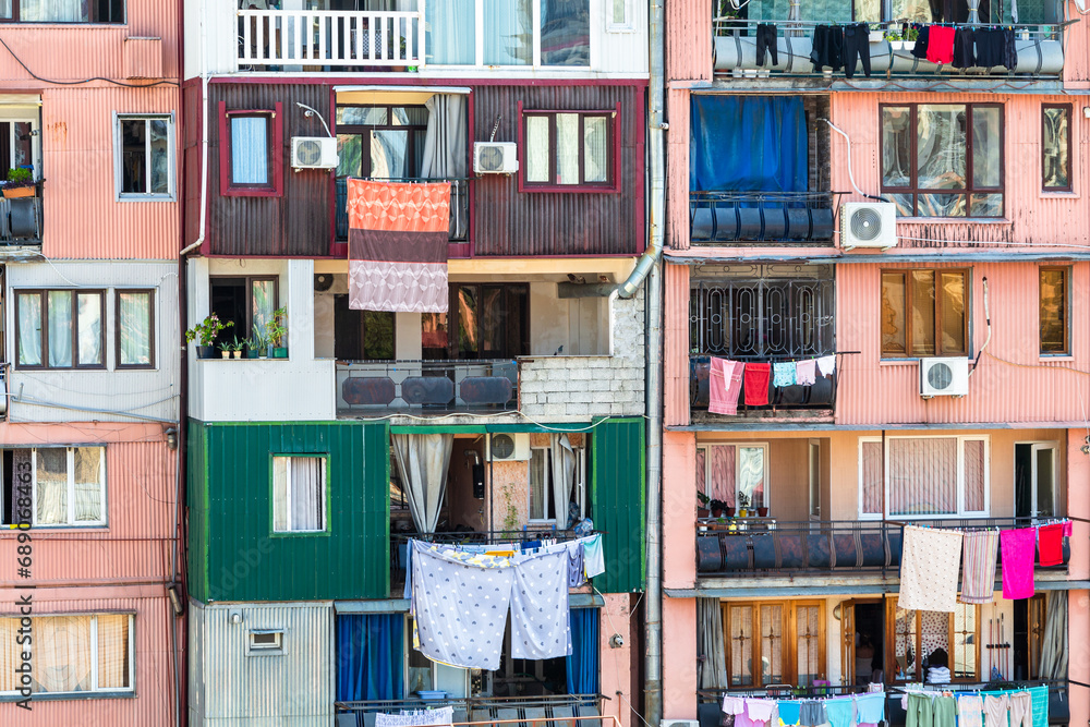 travel to Georgia - facade of multi-storey house in residential district in Batumi city with laundry drying on balcony on sunny morning