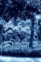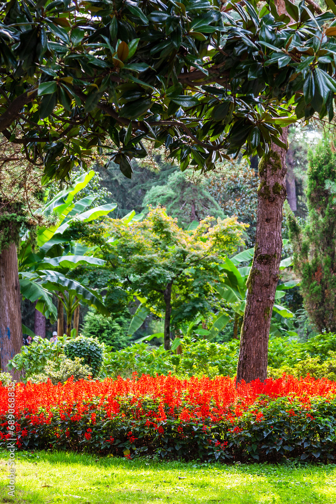 travel to Georgia - red flowerbed illuminated by sun on green boulevard in Batumi city on sunny autumn day