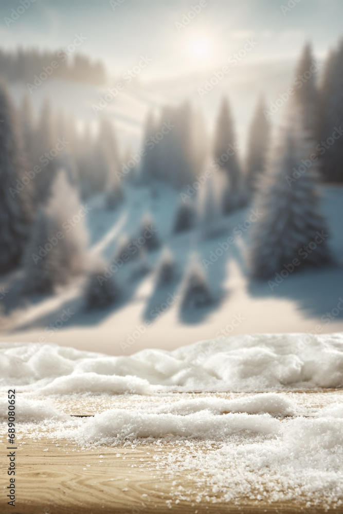 Wooden desk of free space for your decoration. Winter landscape of mountains. Board cover of snow and frost. December time and christsmas compositon. Natural light and empty mockup backdrop.
