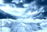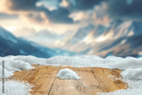 Wooden desk of free space for your decoration. Winter landscape of mountains. Board cover of snow and frost. December time and christsmas compositon. Natural light and empty mockup backdrop.