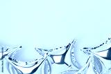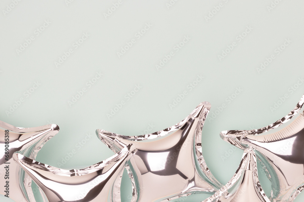 Silver foil star balloons on a blue background. Festive concept with copy space. Selective focus.
