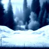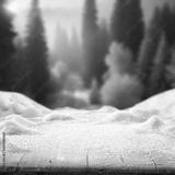 Wooden desk of free space for your decoration. Winter landscape of mountains. Board cover of snow and frost. December time and christsmas compositon. Natural light and empty mockup backdrop.