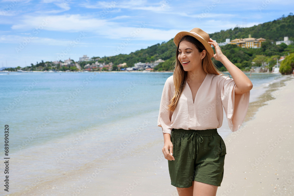 Happy stylish young woman walking on Jurere beach, Florianopolis, Santa Catarina Island, Brazil