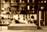 Wooden pedestal of free space for your decoration. Kitchen interior with furniture. Window and morning sun light. Board of brown wood and mockup backdrop. Empty space for your products, natural light