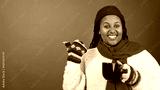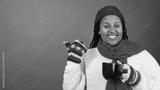 Beautiful young woman in winter outfit points to copy space, Christmas studio