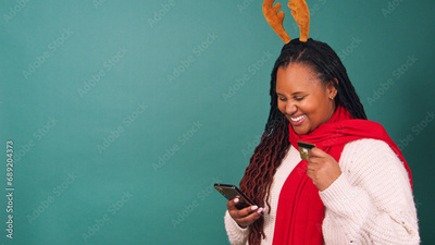 Happy young woman waves credit card, online shopping for Christmas, copy space
