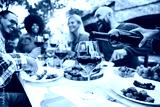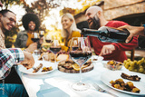 Happy friends having bbq dinner party in garden restaurant - Cheerful family drinking red wine together sitting at dining table - Food and beverage concept with guys and girls eating fresh meal