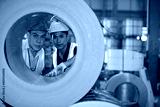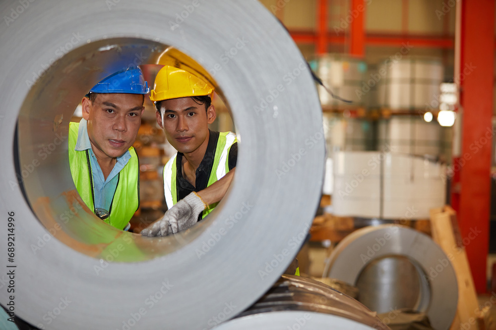 portrait factory workers or engineers looking though a rolls of industrial aluminum metal material in the factory