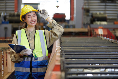 female factory workers or engineer smiling and holding clipboard beside machine in the factory