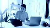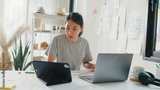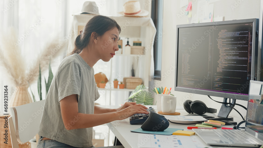 Young Asia girl IT development programmer typing on keyboard coding programming fixing data code on laptop computer screen follow code plan in tablet and paperwork on table workroom at house office.