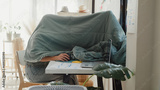 Night owl Young Asia girl development programmer use blanket cover need dim light concentrate create coding program database on computer at house office. Workaholic suffering mental health concept.