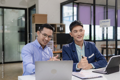 Two Asian businessmen discuss pitching startup ideas, brainstorming ideas, analyzing and planning for business success.