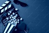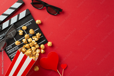 Film of Love: top view shot featuring clapperboard, 3D glasses, popcorn spilled from box, and heart-themed decor on a passionate red backdrop—an ideal setting for a romantic movie premiere