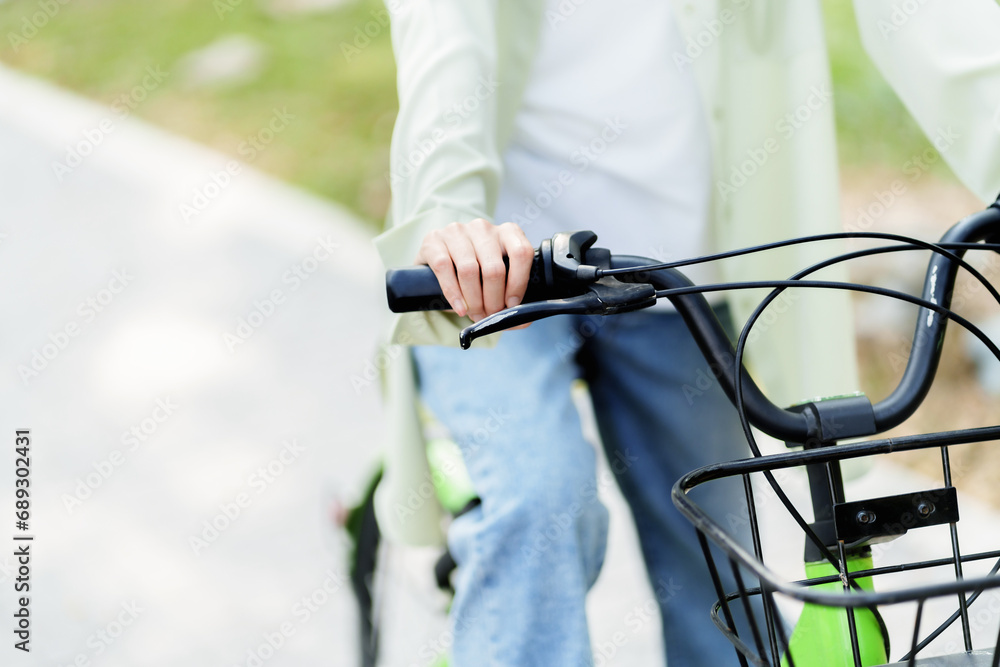 Healthy wellbeing lifestyle, Young asian female riding bicycle at public park.