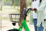 Healthy wellbeing lifestyle, Young asian female riding bicycle at public park.