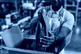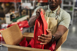 Close up of Black young man carefully putting coffee bags in cardboard box at packaging and shipping workshop, copy space