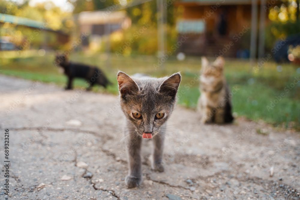 A beautiful cat walks outside, a street cat in a beautiful autumn park