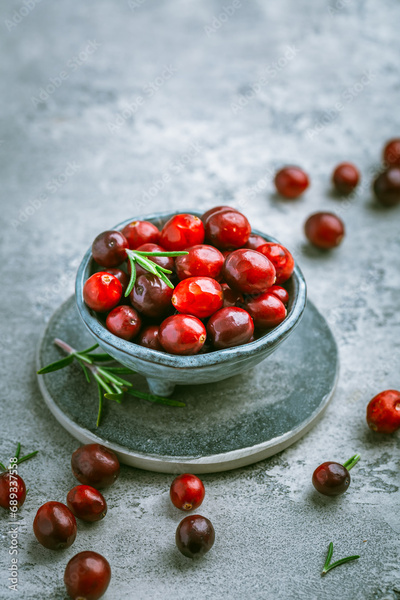 Organic Cranberries in a bowl on grey background