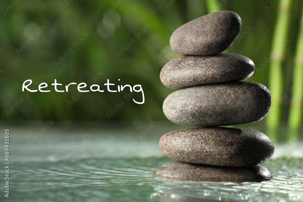 Wellness retreat. Stacked pebble stones in water on blurred background, closeup