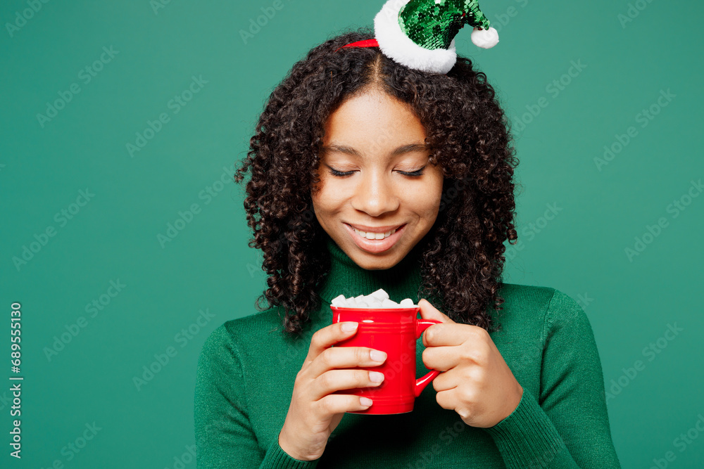 Close up merry little kid teen girl wear hat casual clothes posing drink coca with marshmallow isolated on plain green background studio portrait. Happy New Year celebration Christmas holiday concept.