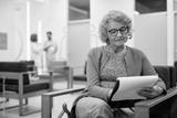 Mature woman filling out medical paperwork while sitting in waiting room at doctor's office.
