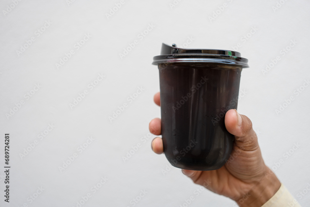 Iced black coffee or iced americano on man hand. Refreshing morning drink