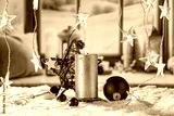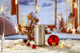 Window sill background and Christmas tree decoration, Happy New Year party , pedestal card, empty space and pattern, family home interior, celebration time in cold december night.