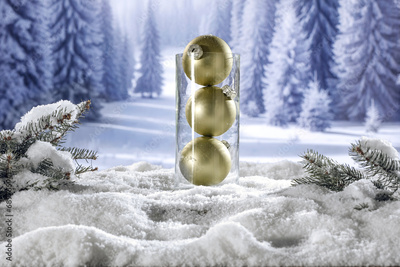 Winter background of free space for your decoration. Snow and frost and christmas tree branch. Cold december day and natural landscape of forest.