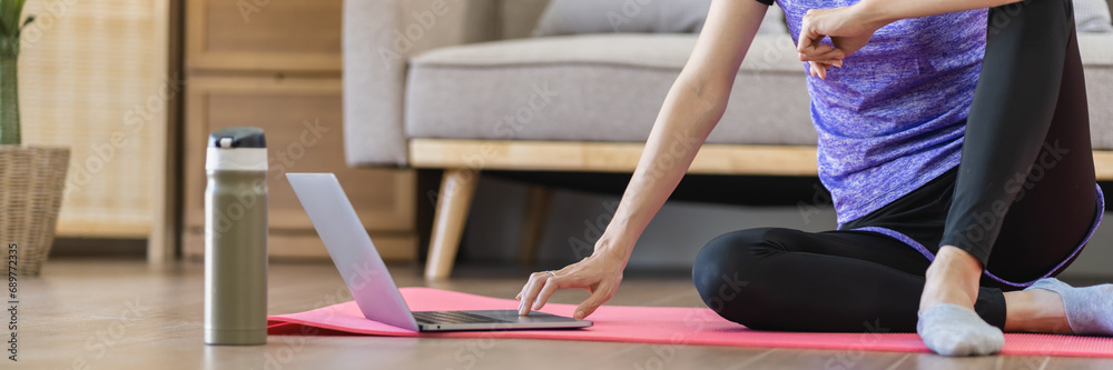 Athletic woman in sportswear study watch online lesson course training exercise at living room.