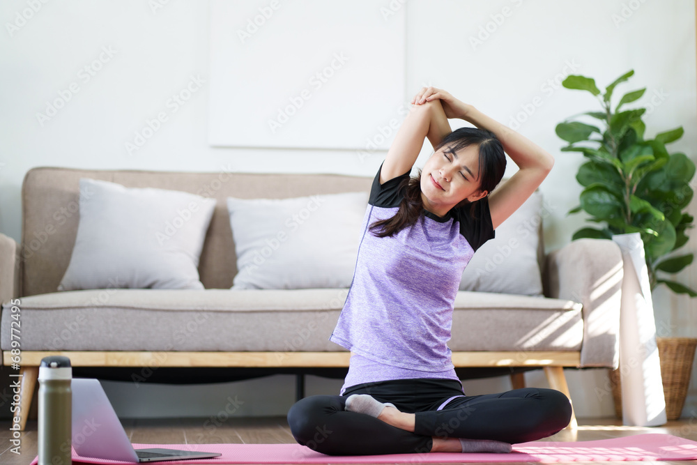 Athletic woman in sportswear study watch online lesson course training exercise at living room.