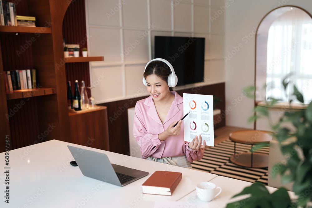 Businesswoman showing business chart while meeting on video conference and remote working at home